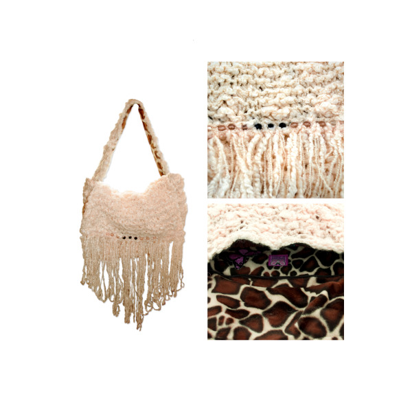 Handmade and stylish, this crochet-style bag is great for holding all of your on-the-go necessities such as: wallet, cell phone, make-up pouch, snacks and more. Purses have an over-the-shoulder style with a flap that comes over a secure zip closure. Every bag is hand knit with cream colored yarn. Stylish touches include yarn fringe and a peach/black bead lining stitched along the fold over flap. The inside of each bag is lined in soft giraffe nylon. Measures approximately 11 3/4" x 7 1/4" with 11 3/4" straps.