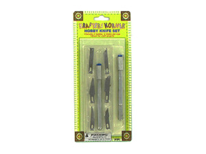 Craft hobby knife set includes 2 handles, 6 blades, and a clear plastic molded case. Use for cutting, trimming, carving, chiseling, and stripping on wood, plastic, rubber, clay, or paper. Steel handles are 3 3/4" with 1/4" diameter and blue plastic blade end. Blades are # 1,2,3,10,11, & 12. Storage case is 5" x 1 5/8" x 5/16". The set comes blister carded with UPC code. Not for use by children