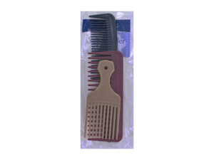 The super styler comb pack comes with a pick comb, a standard comb and a rectangle comb. Each comb is made of sturdy plastic. There are 3 combs per pack. Comes packaged in a hanging poly bag.